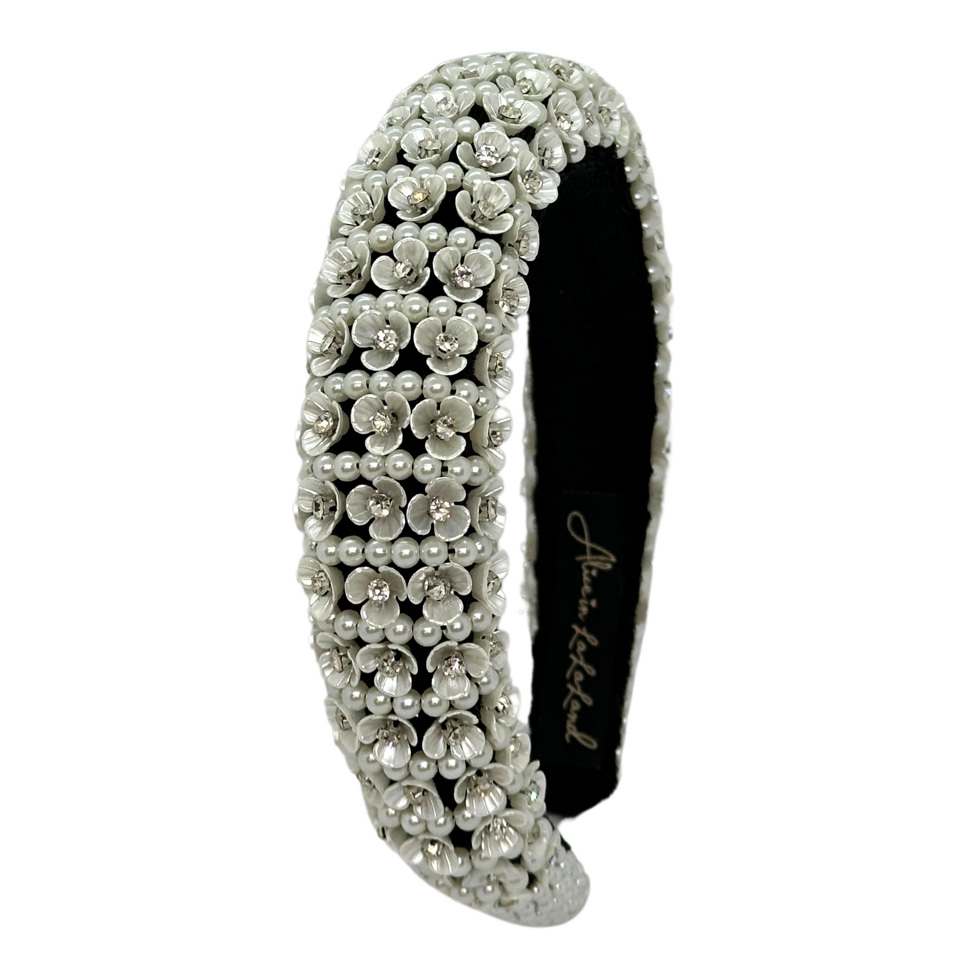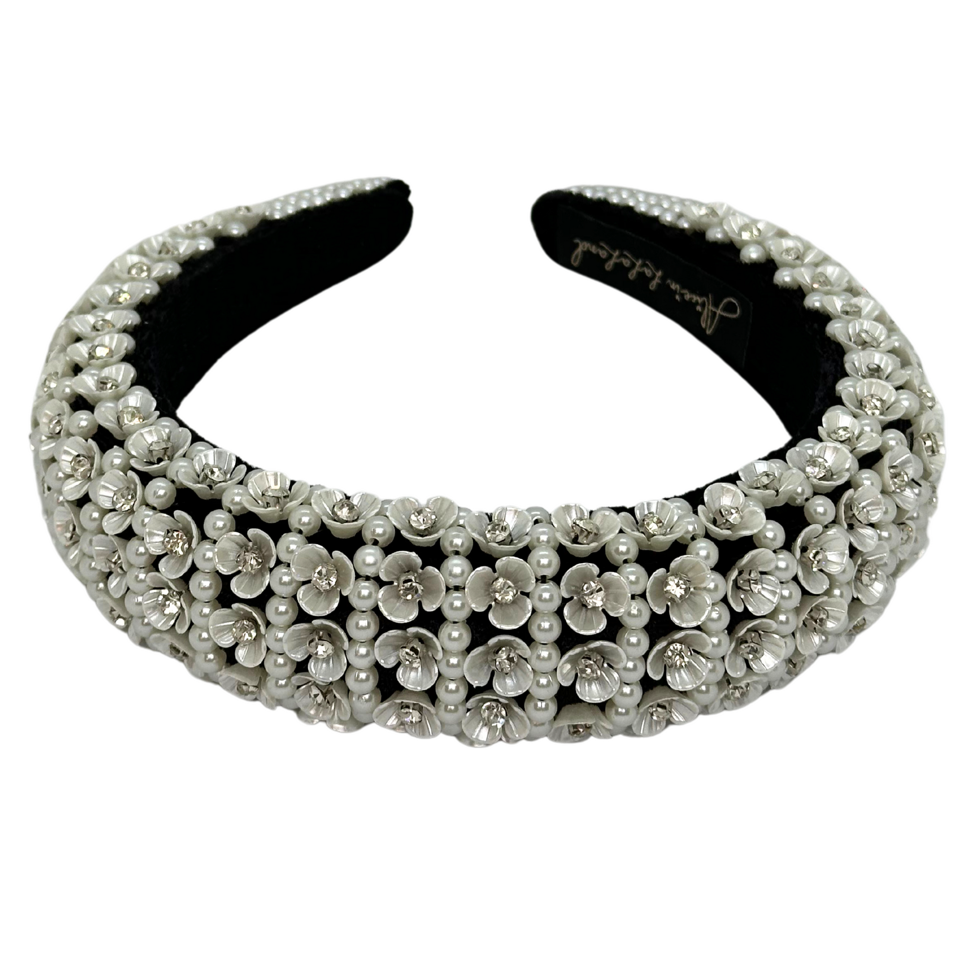 Introducing the Ava Sparkle Headband, a padded piece adorned with sparkling silver-studded flowers and pearls all over. This headband is perfect for parties and weddings, adding a touch of elegance and charm to any outfit. Its intricate design and dazzling details make it an ideal statement piece to elevate both casual and formal looks.