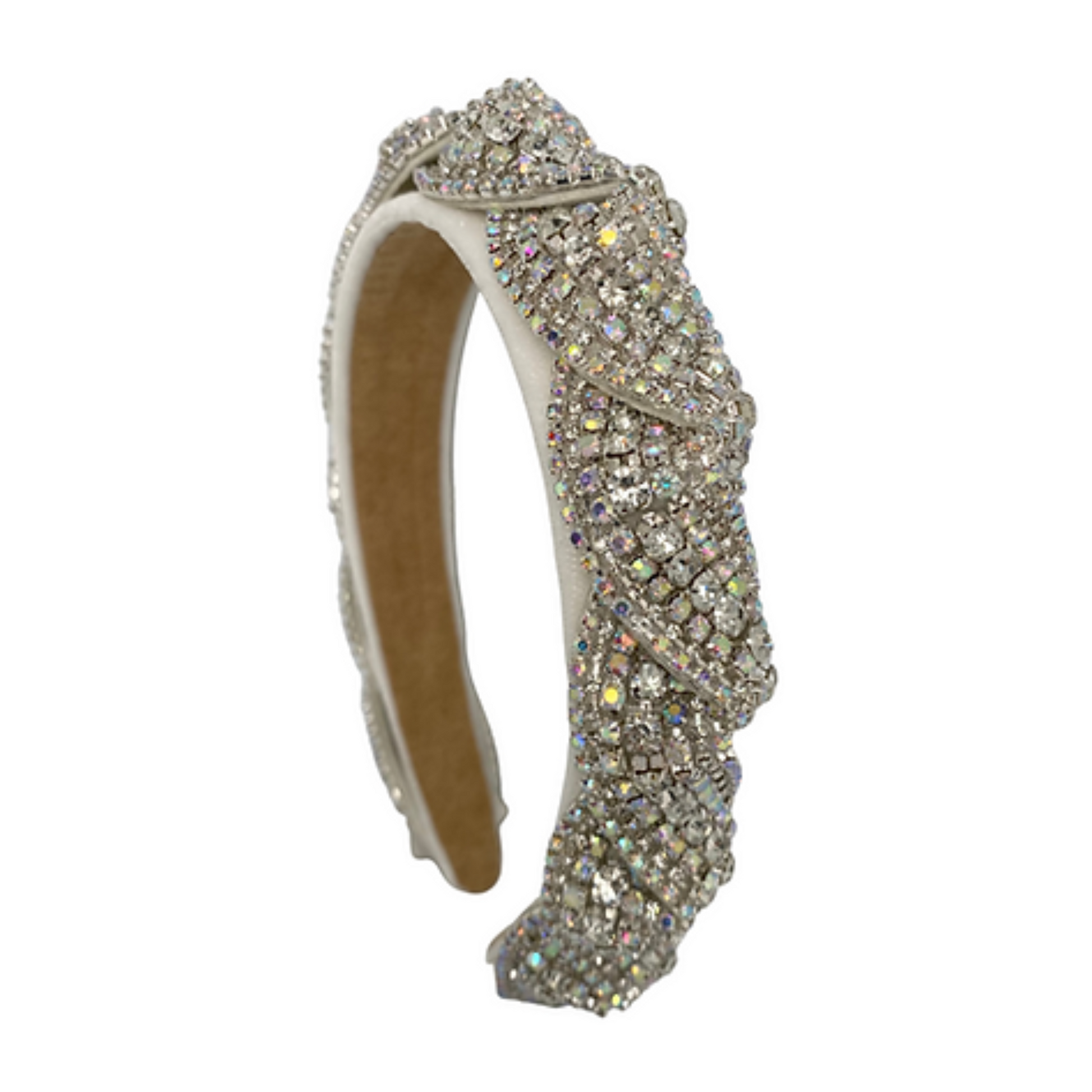The bridal crown, inspired by international glamorous icon Diana, Princess of Wales, is the collection of eye catching dazzling headband. Twisting Diamond Crown is a modern architectural twisted design femed up with classic diamond accent crystal studs on white velvet. Wear it to amp up your bridal style sparkly and ritzily.