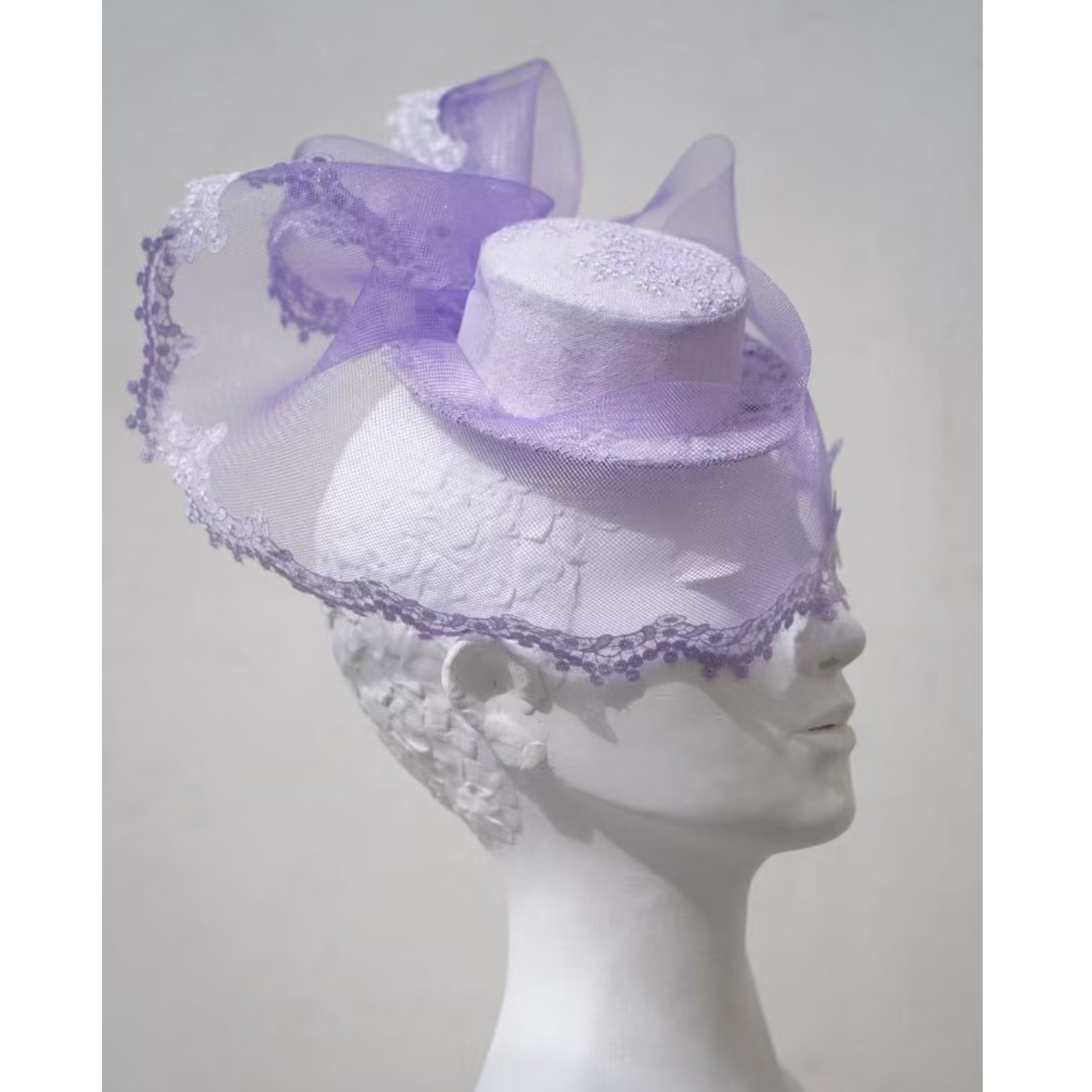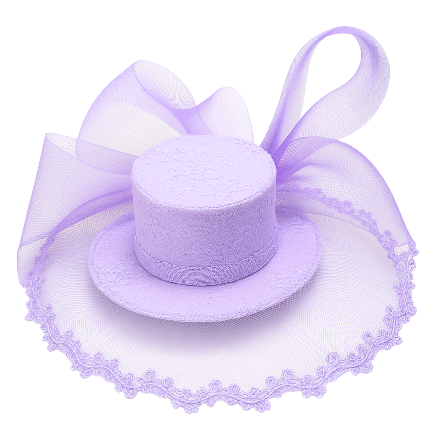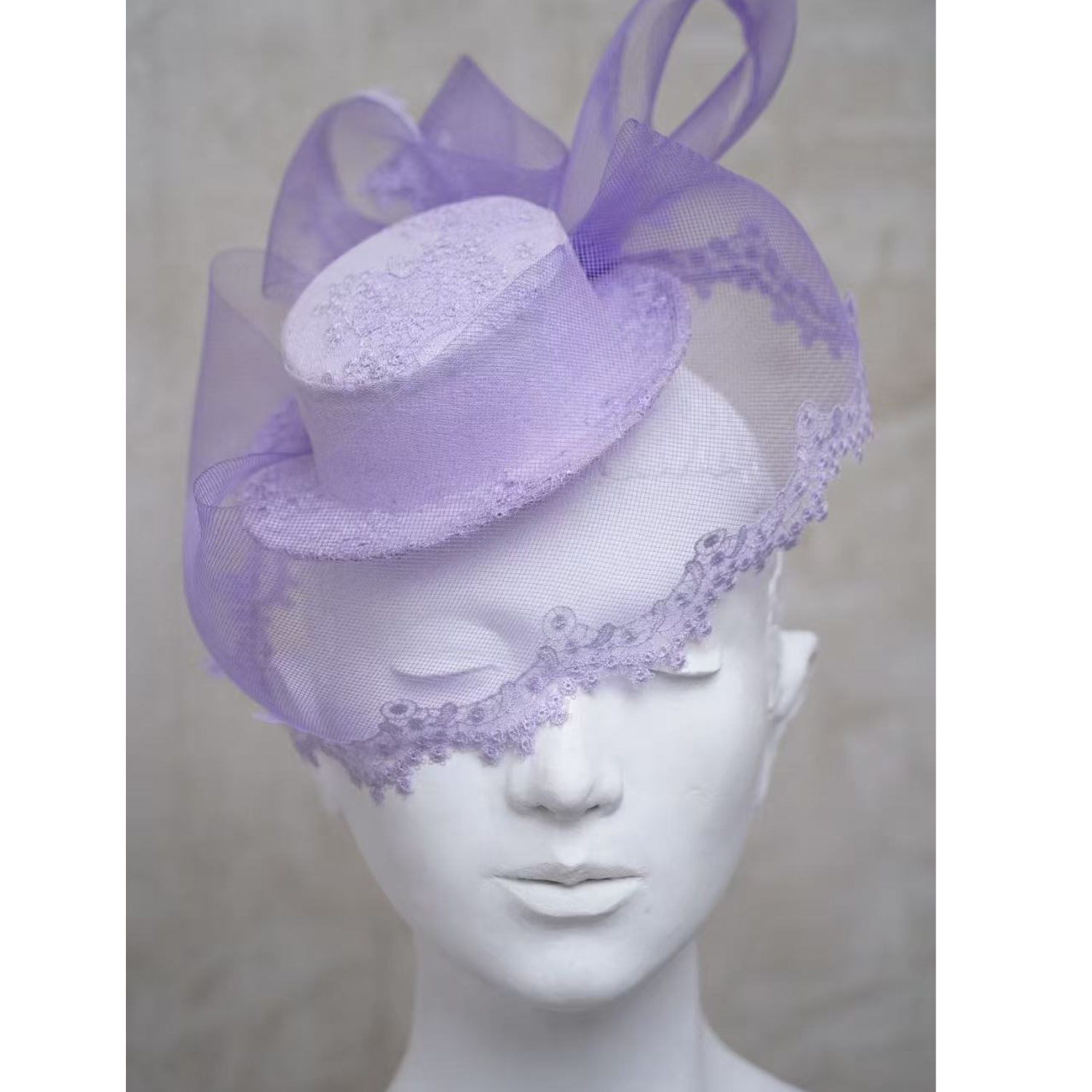 A fairytale-like fascinator inspired by timeless royal elegance. Crafted in soft lilac tones, this delicate headpiece features exquisite handmade lace, encircled by French lace that whispers vintage romance. A dramatic lace bow graces the back, adding a regal flourish worthy of a princess at court. Light as air yet rich in detail, Fairyveil is the perfect crown for garden parties, royal celebrations, or any occasion where you want to feel both enchanting and royally refined.