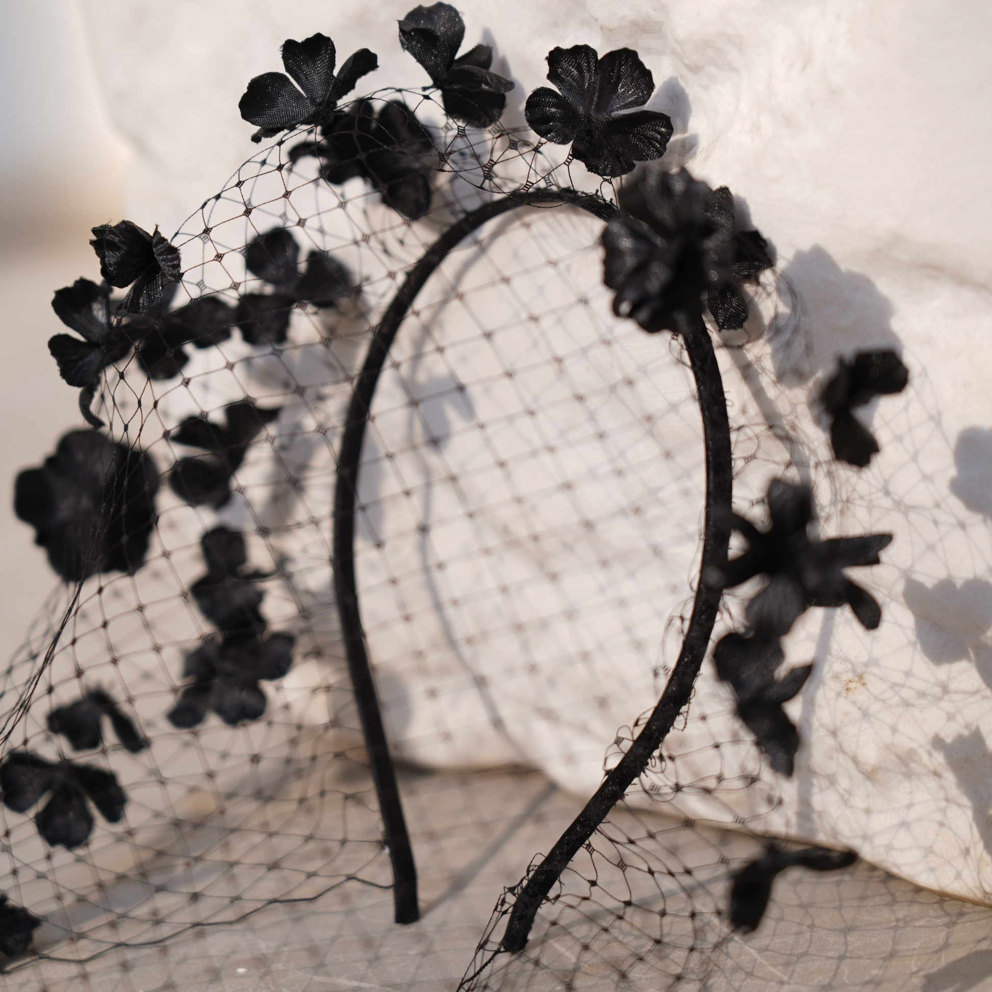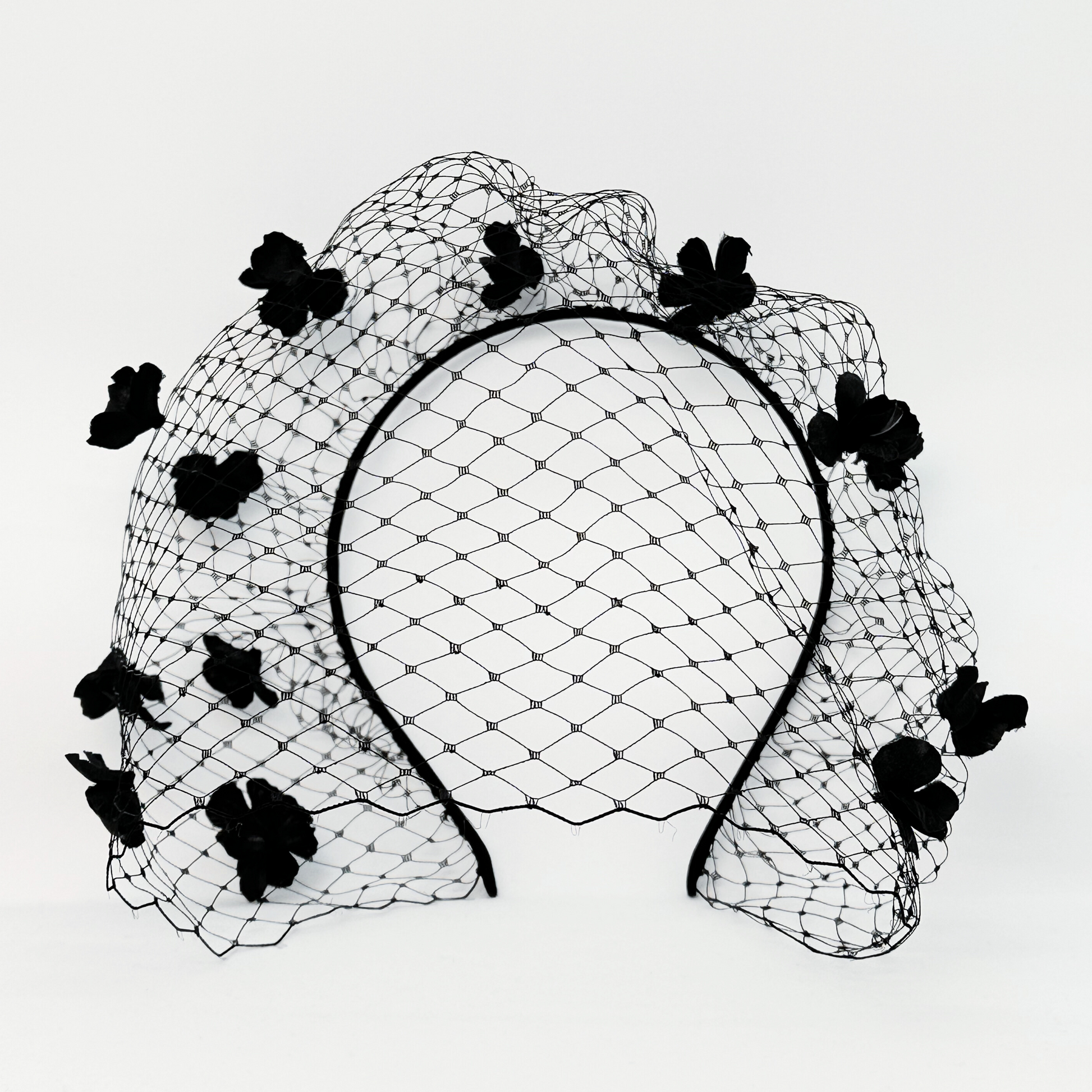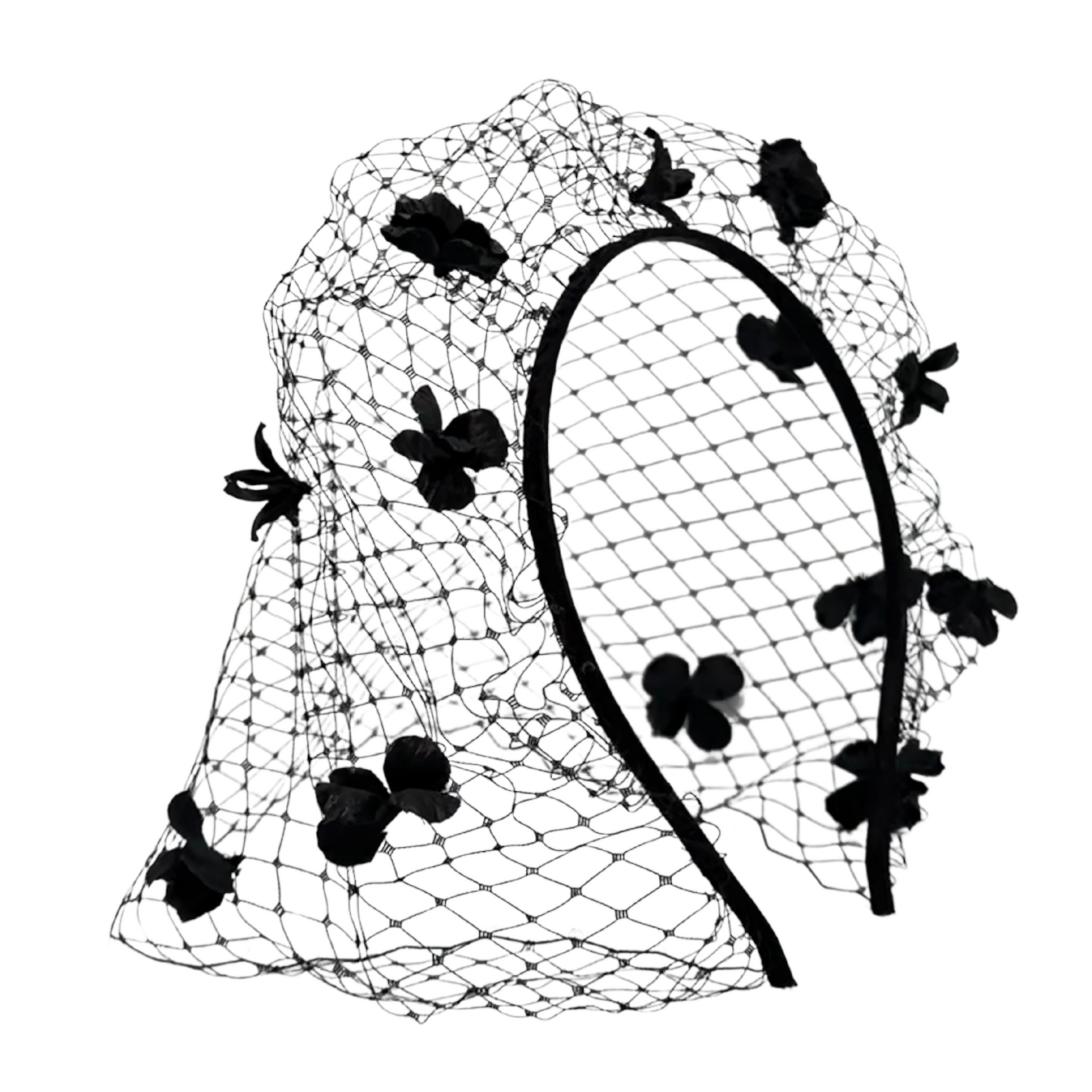 Jade Noir Veil, a French-inspired, enchanting head accessory that embodies mystery. A delicate black net drapes over half of the face, with butterfly-like black satin details enhance its enchanting appeal. Making it perfect for Gatsby-inspired soirées or elegant masquerade balls. Ideal for those seeking a bold and refined look.