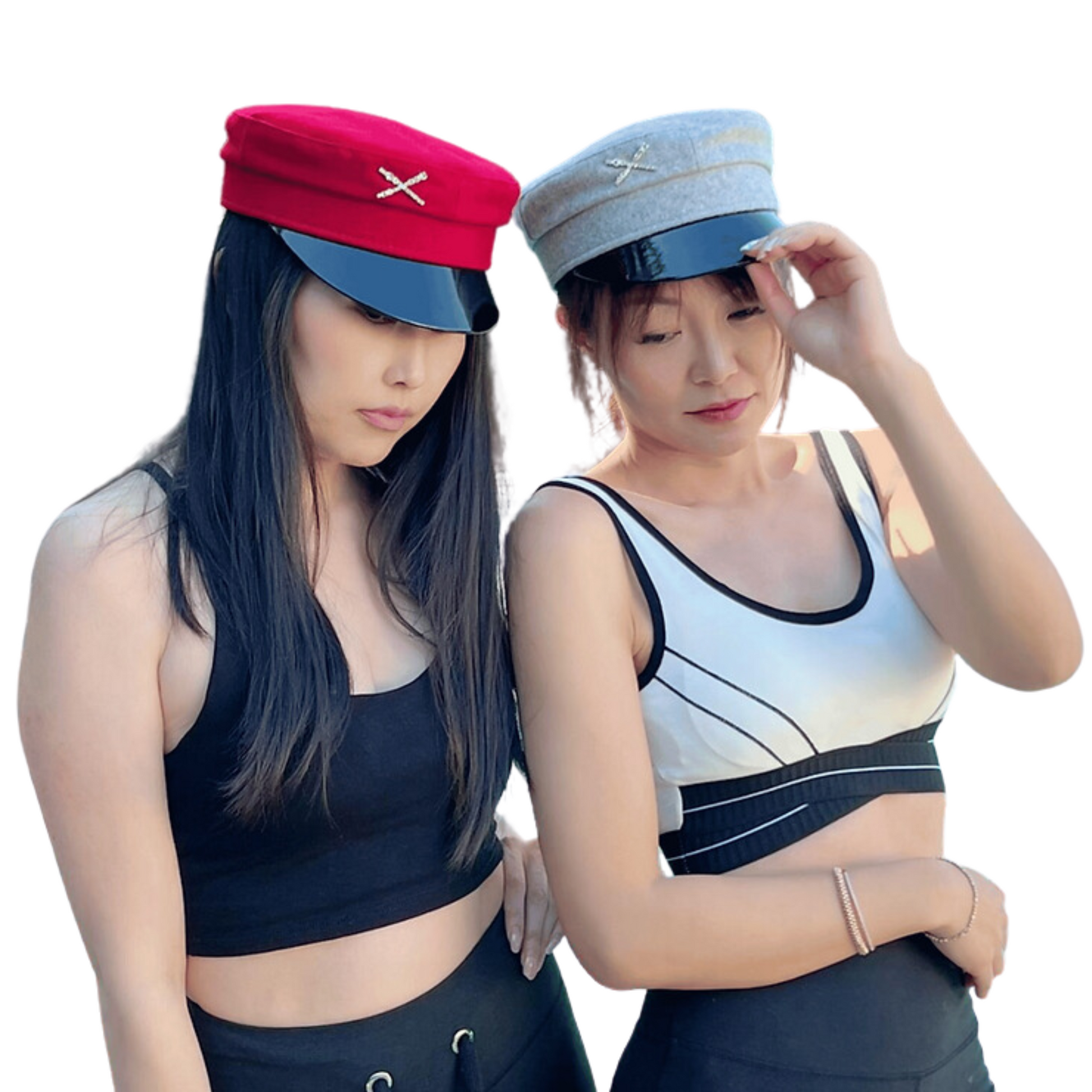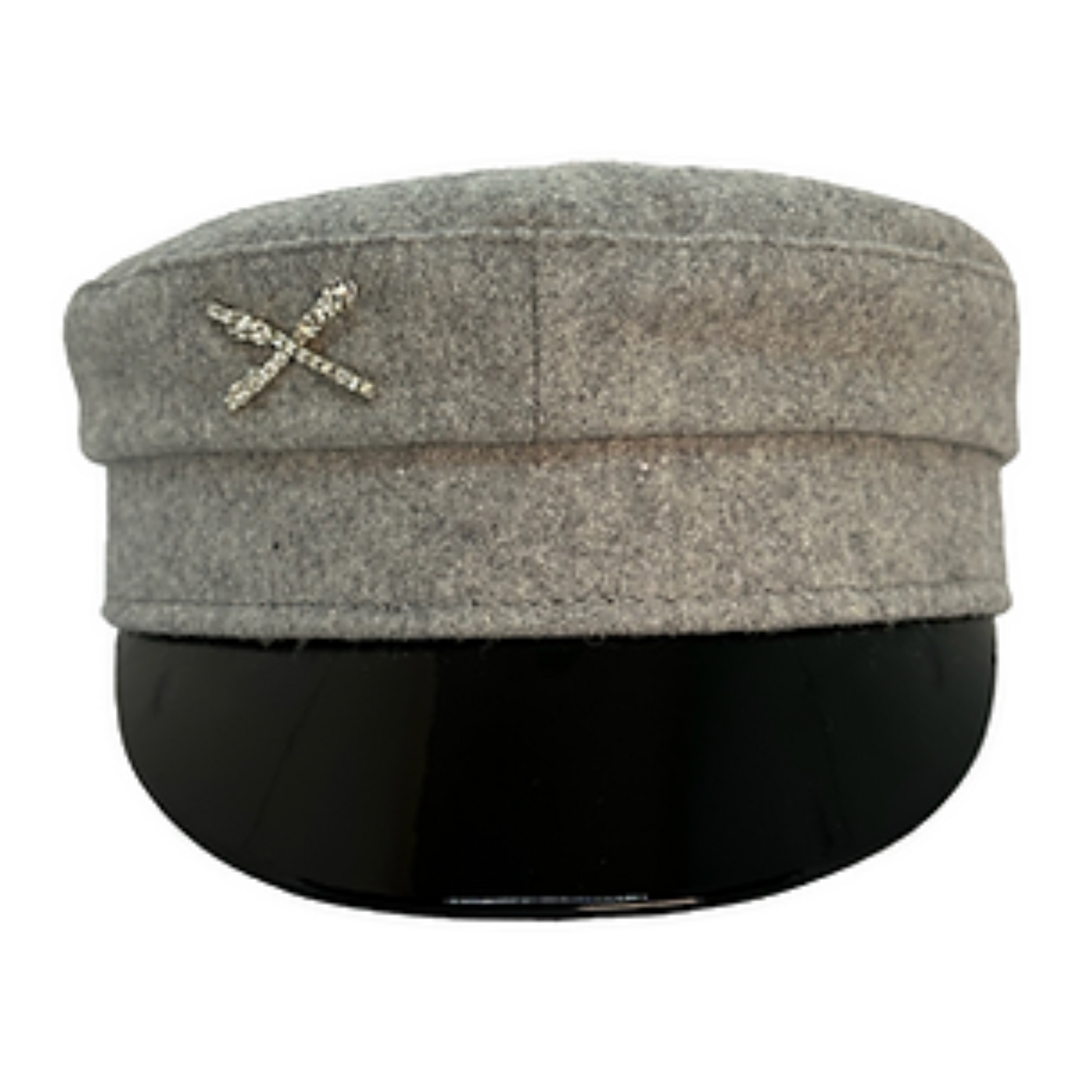 Elevate your style with this must-have Jennifer Baker Boy Cap that marries fashion-forward design with a touch of dazzle. Cozy mohair-blend fabric with black faux leather hand embellished sparkling silver crystal cross for a touch of warmth and comfort.