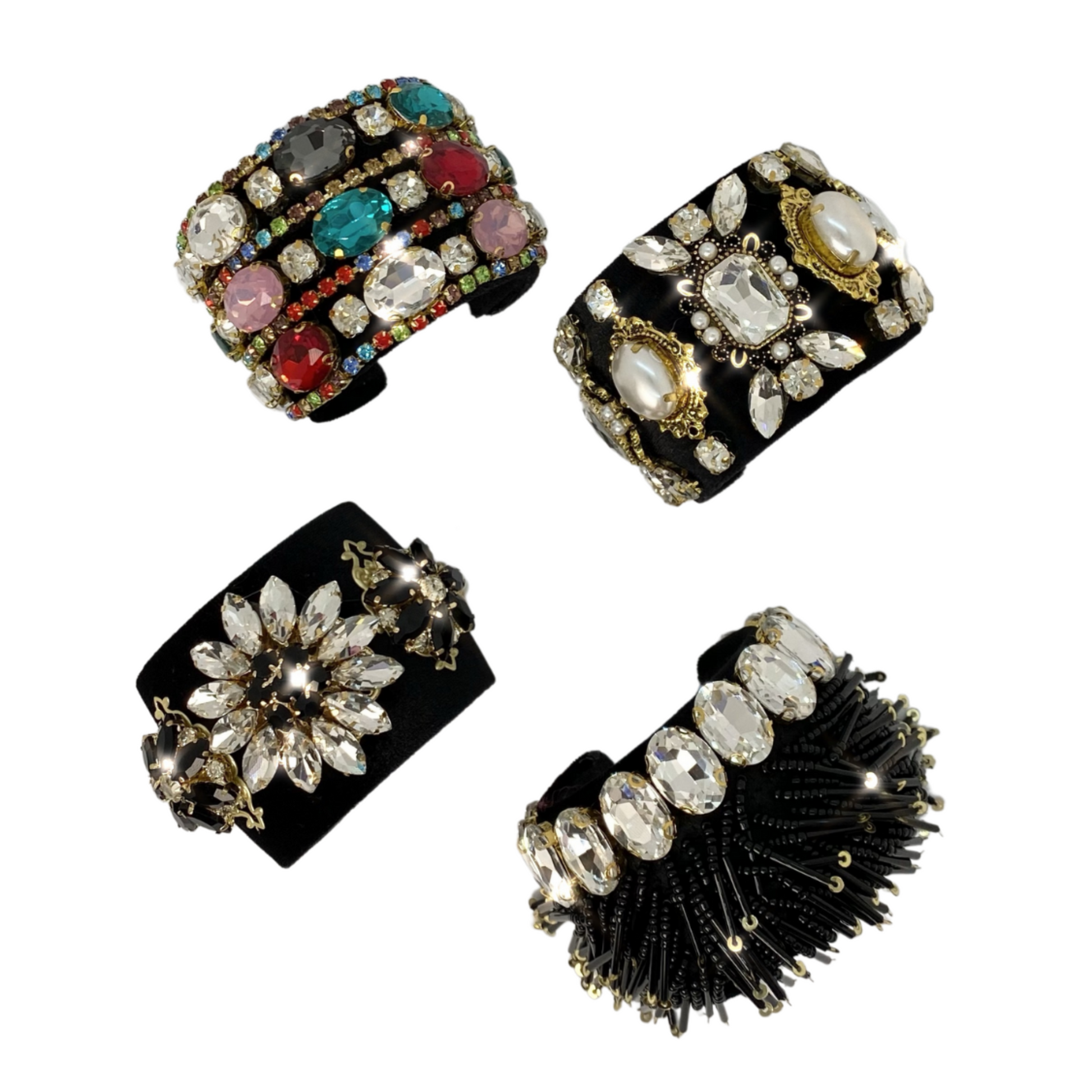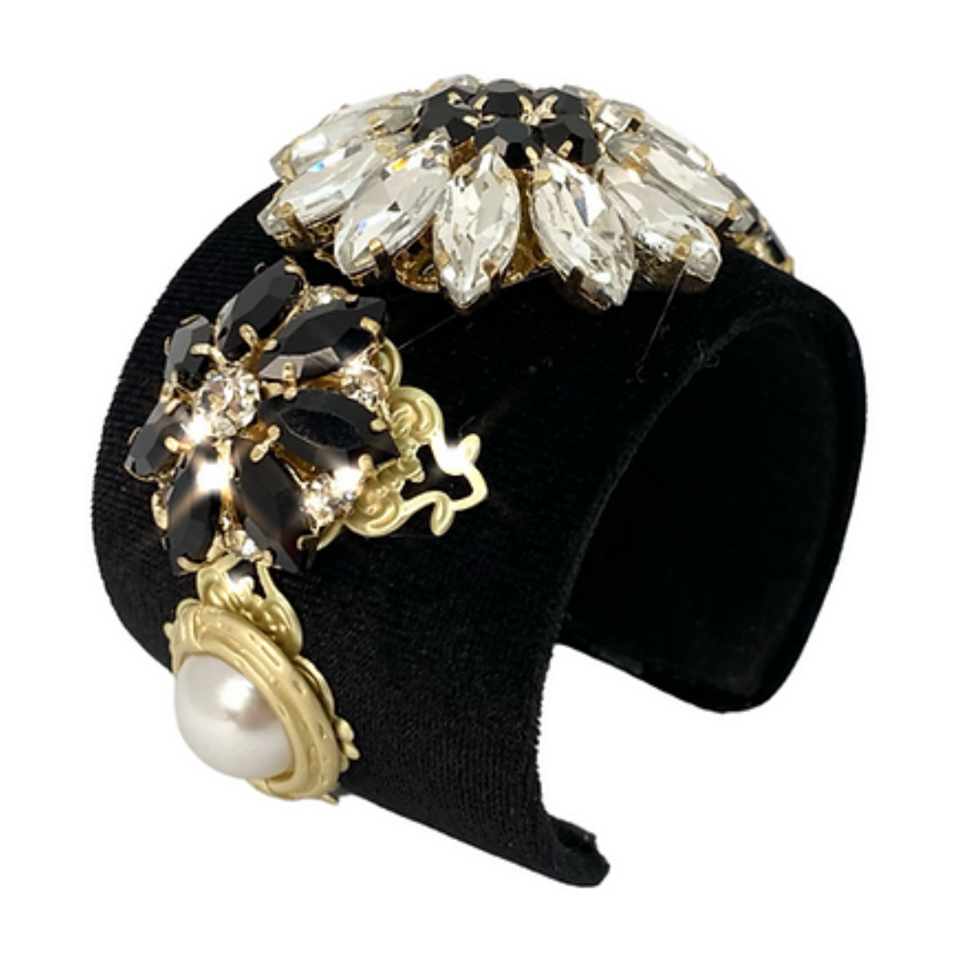 All clear: Black velvet hand embellished all over in navette, round, and victorian crystals in 14k gold plated-brass settings and faux pearls.