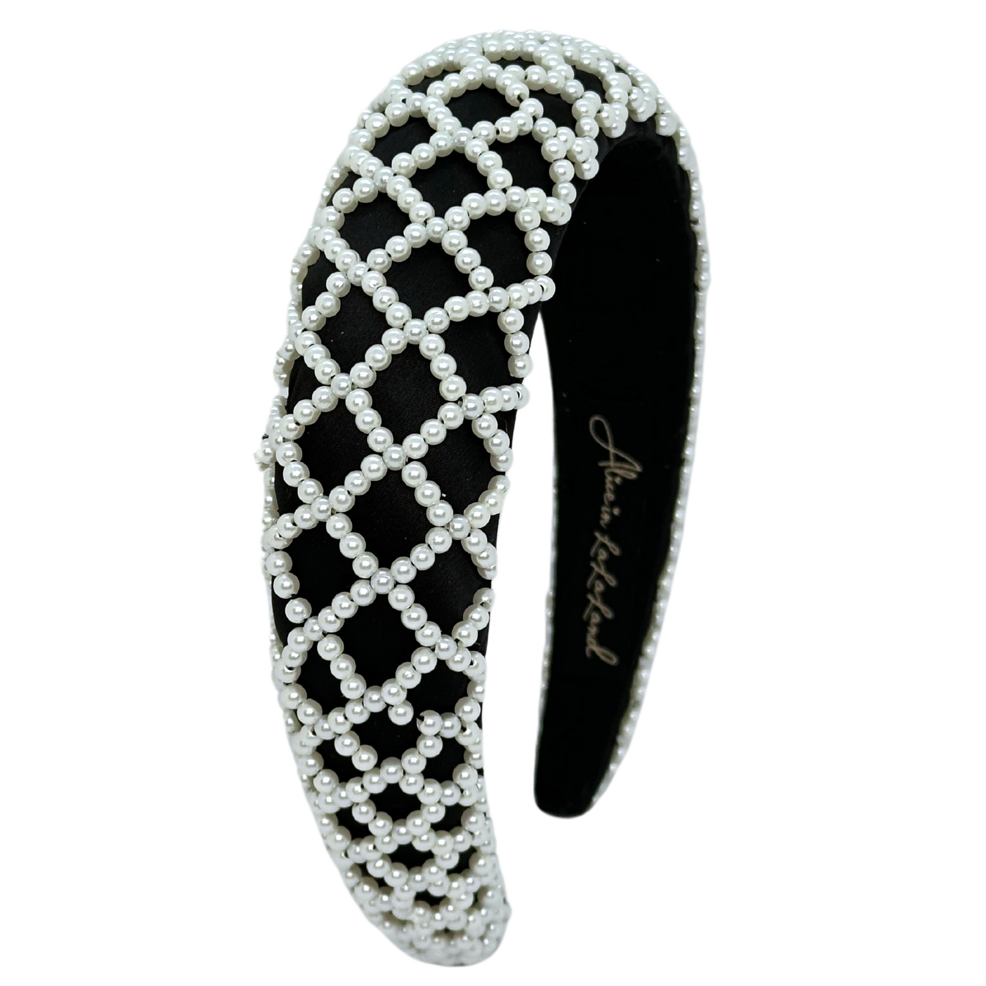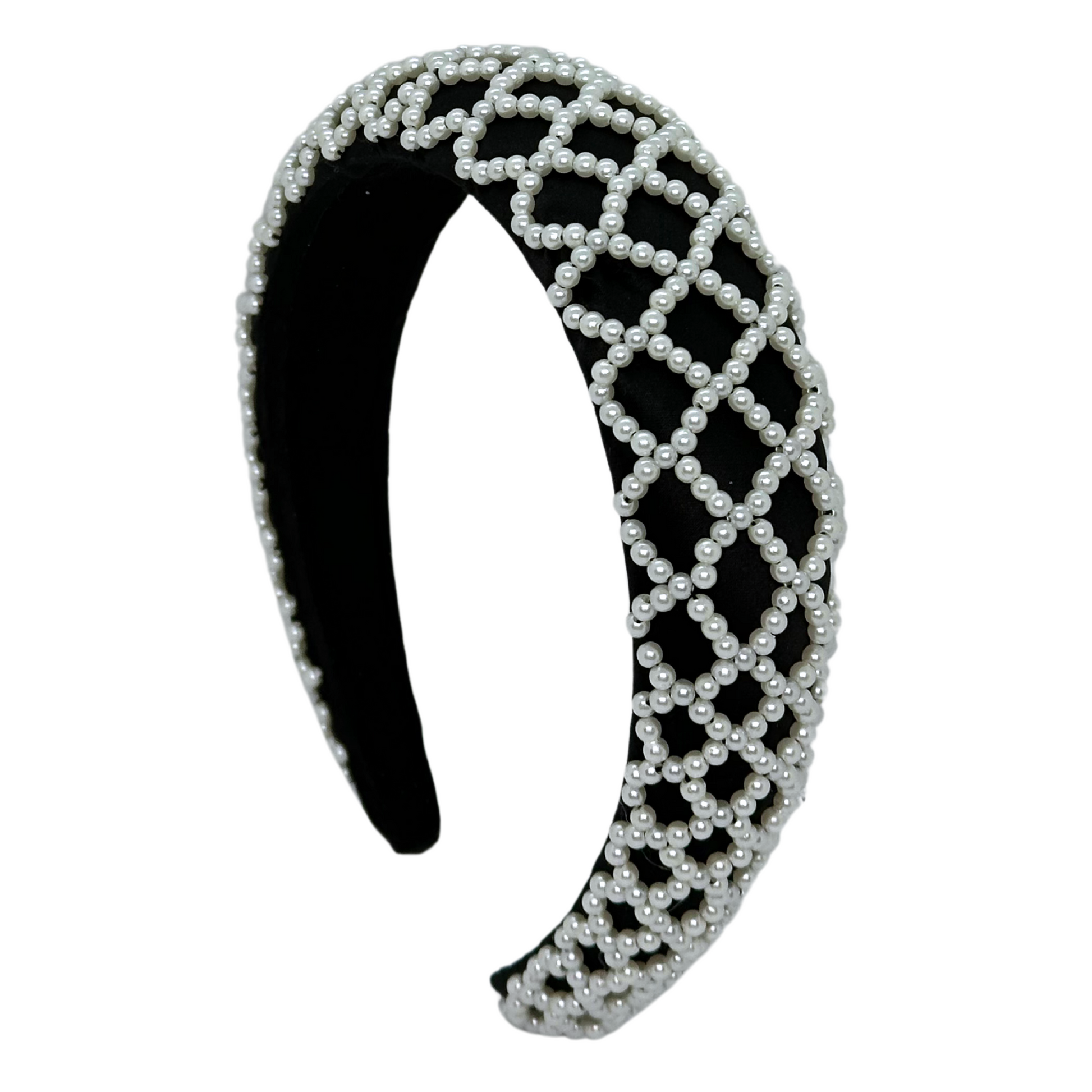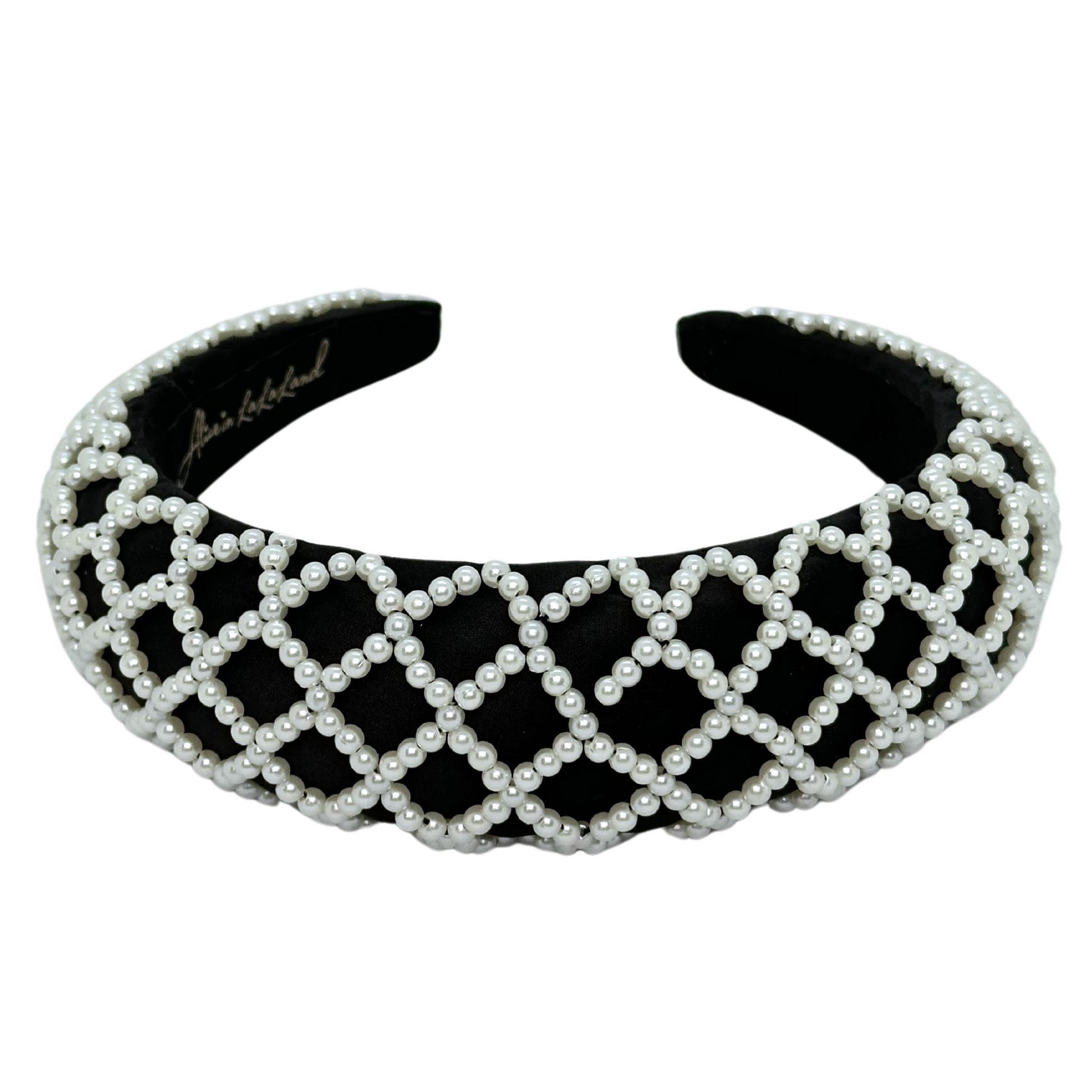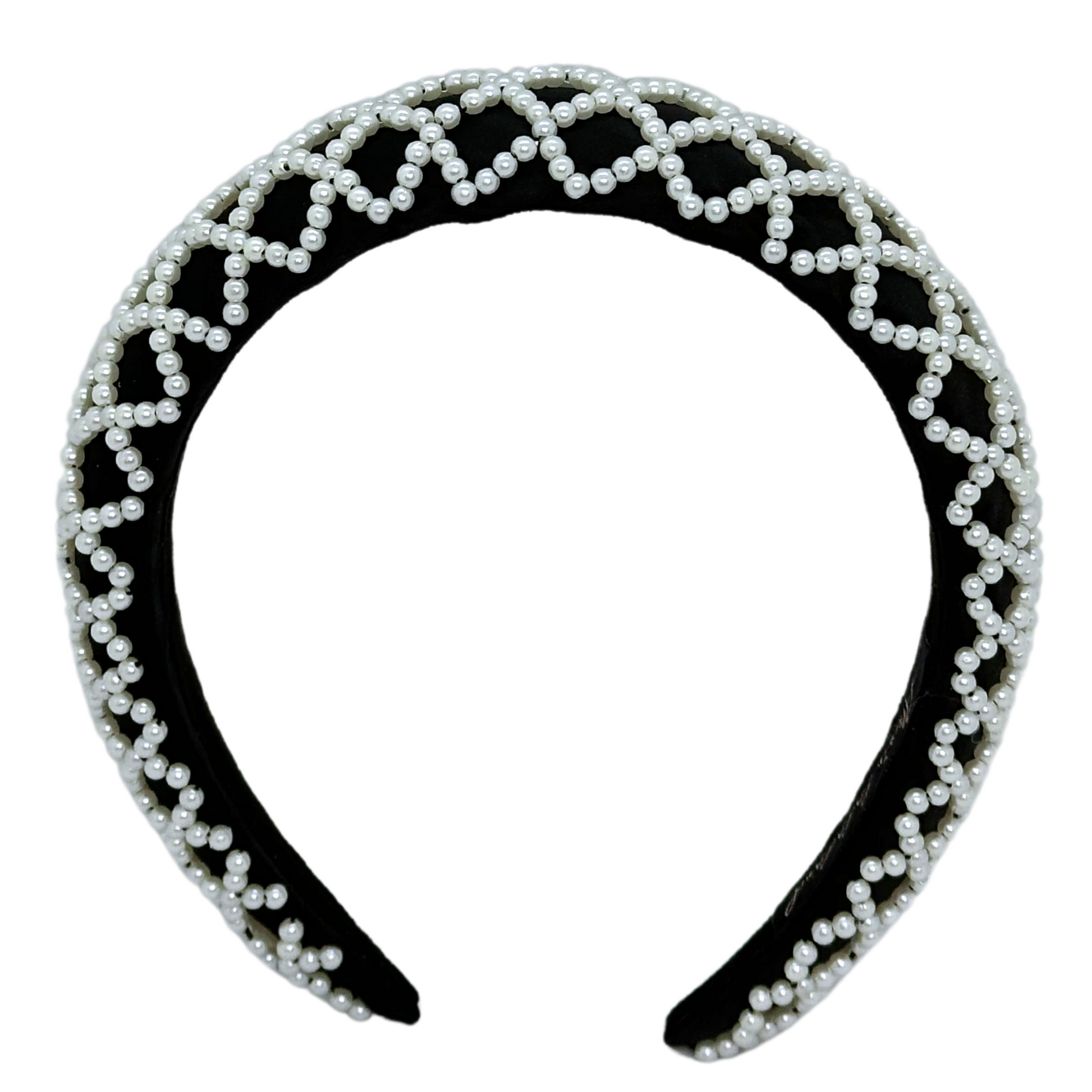 A luxurious padded accessory crafted from soft black satin. Hand-embellished with pearls arranged in a stunning cross pattern, this headband combines elegance with comfort. Perfect for adding a touch of sophistication to any outfit, the Ling Pearl Headband is an ideal choice for both casual and formal occasions.