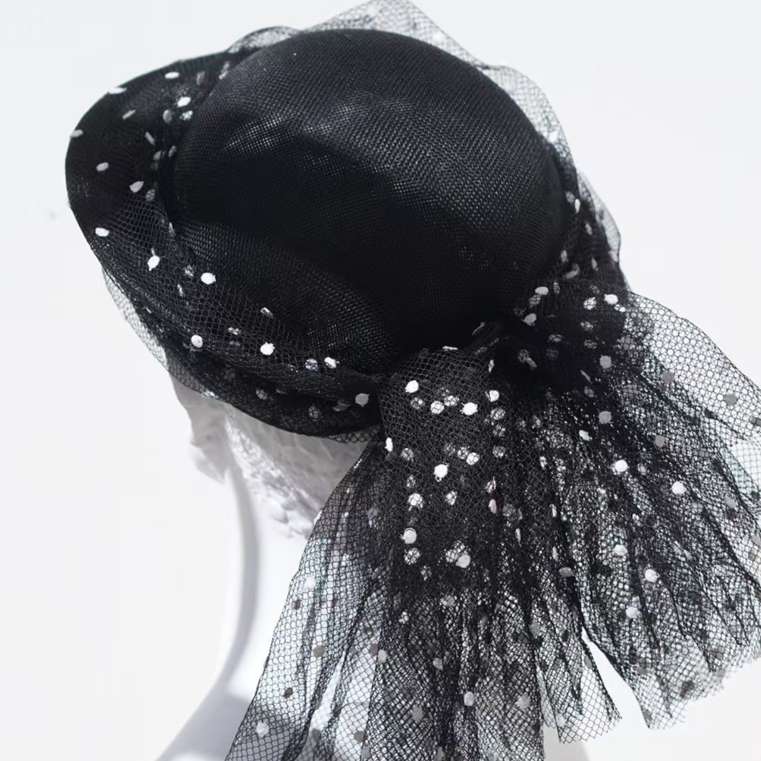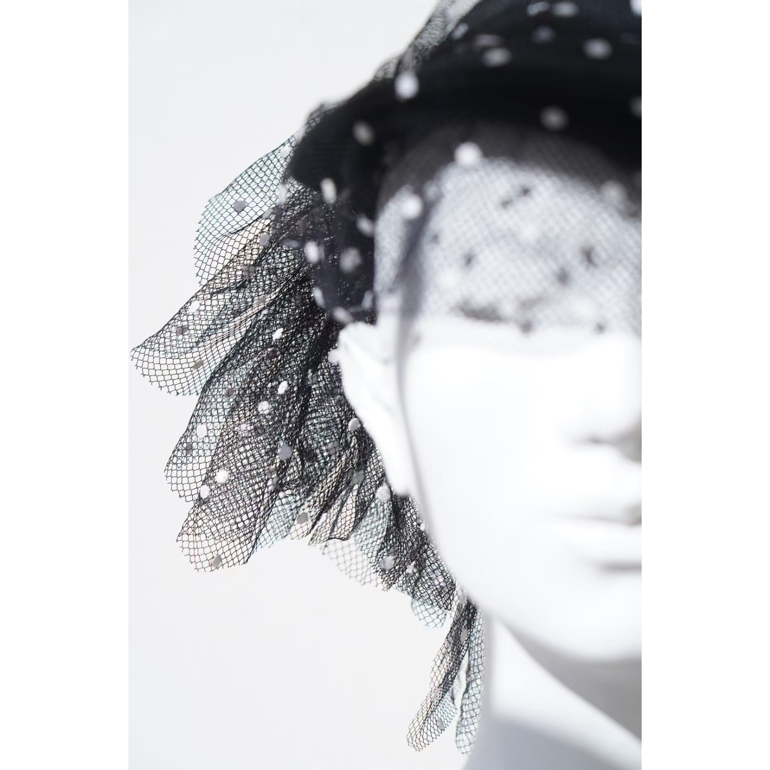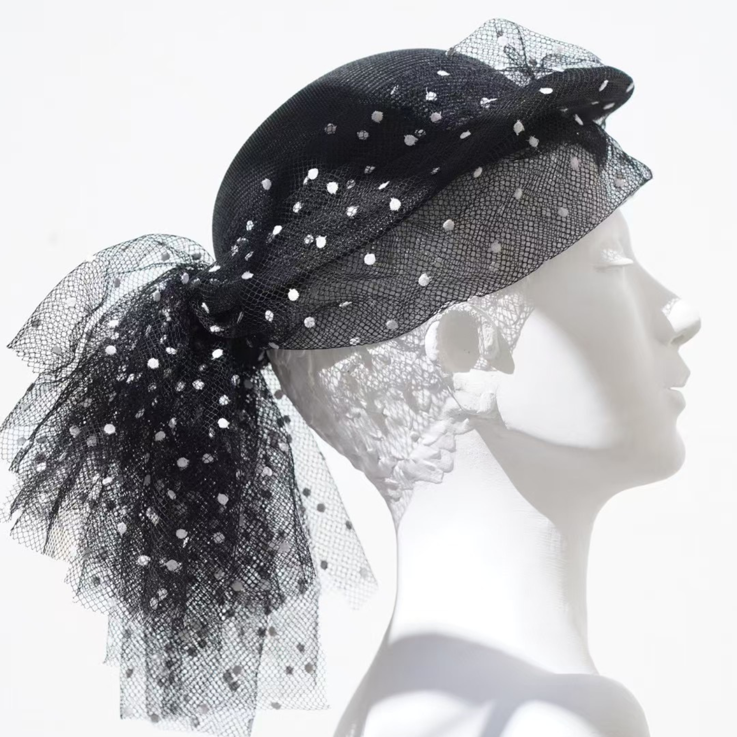 A playful twist, the Polka Veil brings effortless elegance to sunlit moments. Designed in deep black for shallow shade, its classic silhouette is edged with delicate black lace, softly speckled with white dots—like stardust scattered on midnight tulle. A flowing lace drape ties into a generous knot at the back, adding volume, movement, and just the right amount of vintage charm. Light yet luxurious, Polka Veil is your go-to for the days when your outfit needs a whisper of intrigue.
