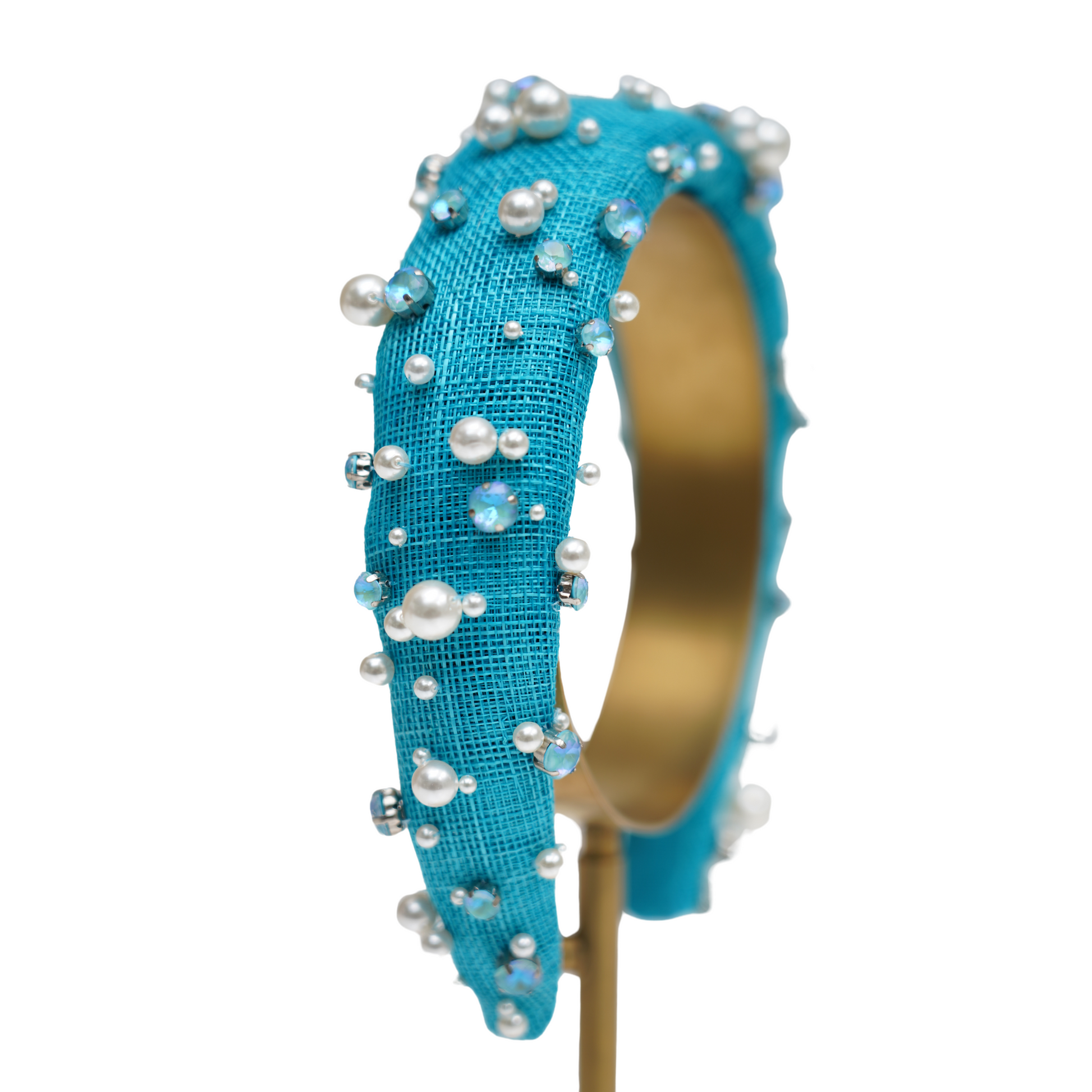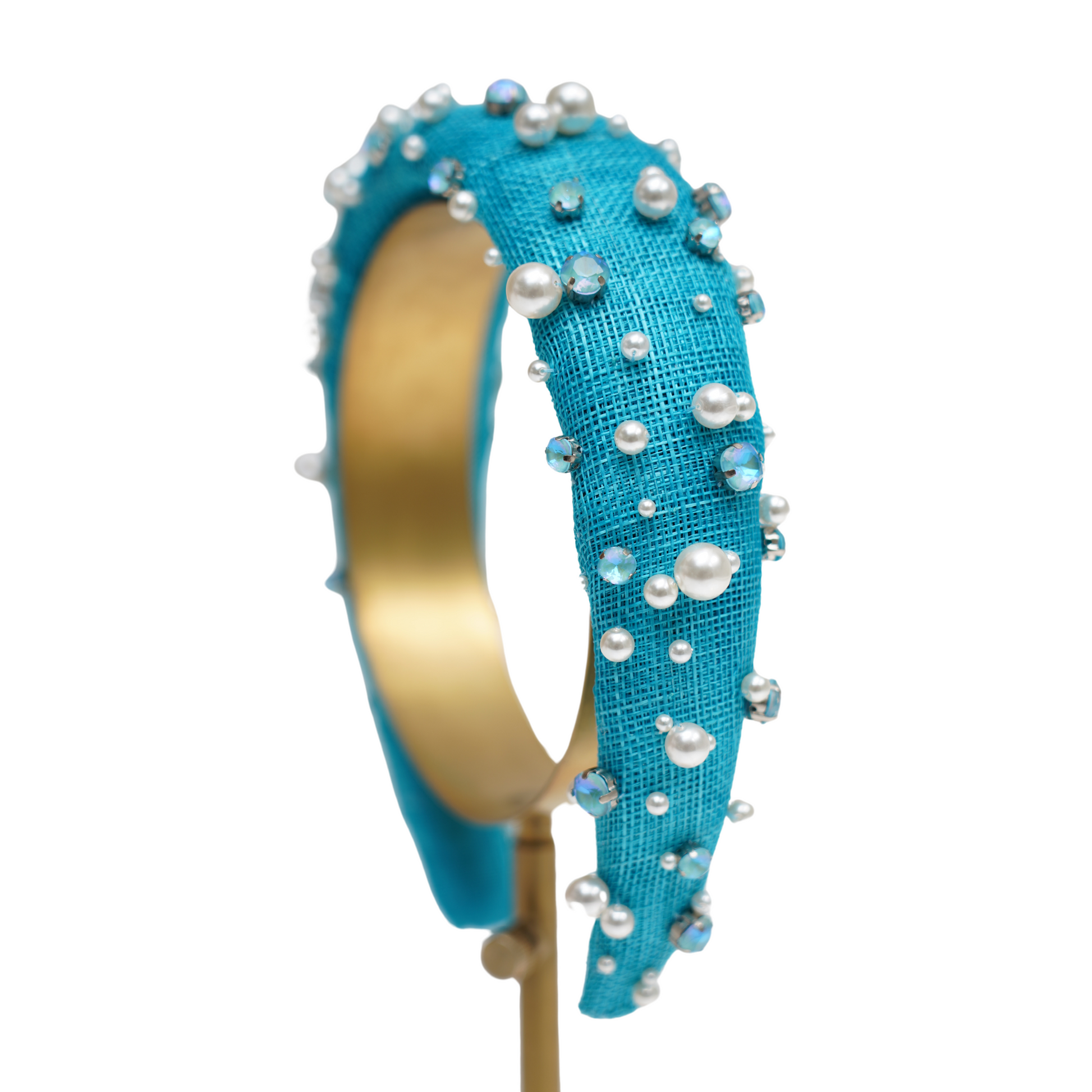 Tiffany Dream Headband, a French designed luxurious accessory that captures the charm of Tiffany blue, exuding classic Tiffany elegance. Made from blue hemp, this padded headband ensures both comfort and style. Hand-embellished with pearls and sparkling blue rhinestones. It showcases a graceful design and meticulous details.
